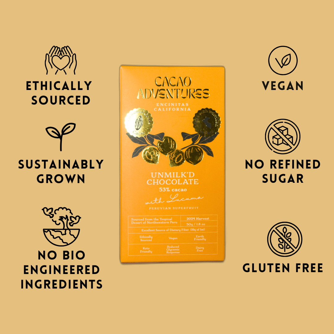 This isn’t your ordinary chocolate. Our Unmilk’d Chocolate is smooth, creamy, and completely dairy-free. Made with 53% rich Peruvian cacao from the tropical desert, it’s naturally sweetened with organic coconut sugar and blended with lucuma, a tropical superfood with a subtle, creamy, caramel-like sweetness.
